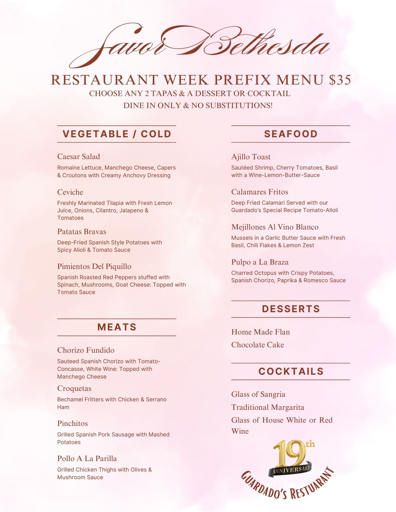 $20 Lunch: Menu; $35 Dinner: Menu