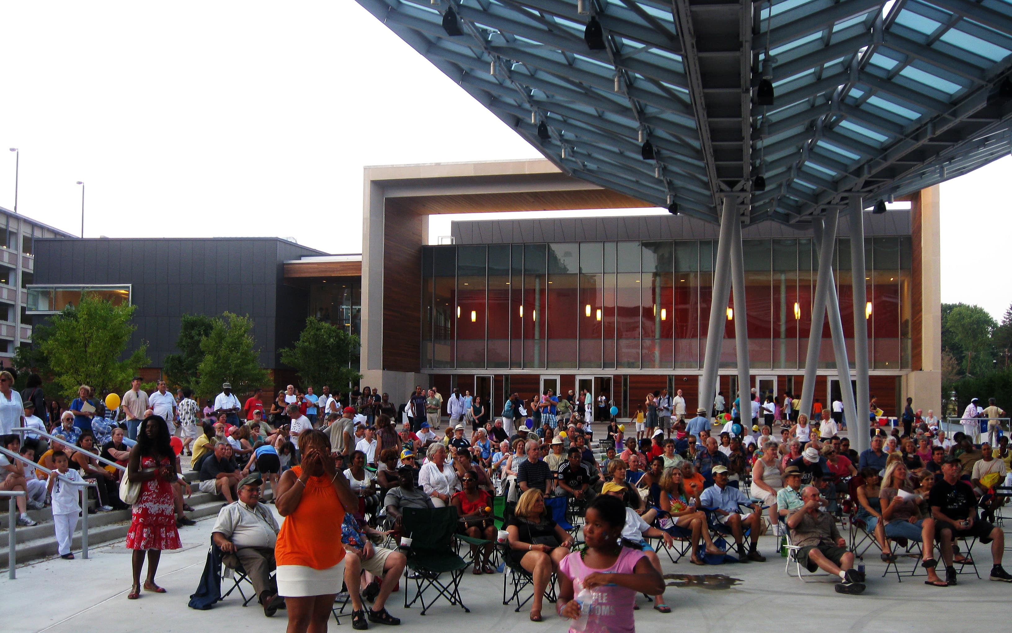 Veterans Plaza is a large public open space that is programmed for festivals and concerts. Under the outdoor pavilion, programs such as the Silver Spring Swings summer concert series take place, and in the winter months it turns into a seasonal ice skating rink. A memorial commemorating the service of County veterans helps make this a special site. For concerts, festivals, or live entertainment events on the Plaza, applications and proposals must be submitted to the Operations Manager. Sufficient staffing, planning, and event management must be in place for outdoor events on the plaza.