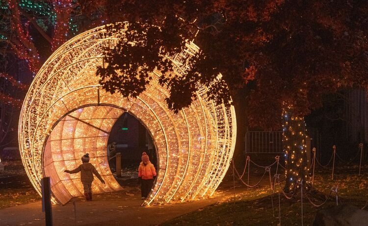 Winter City Lights is an immersive holiday lights experience where guests can walk through a 1.5-mile trail full of twinkling lights and explore over 200,000 square feet of displays covering 18 acres. Enjoy the 200-foot diameter canopy of twinkling lights cascading from the top of the 52-foot Christmas tree. It creates a massive umbrella of lights up above that match to the recorded holiday music.