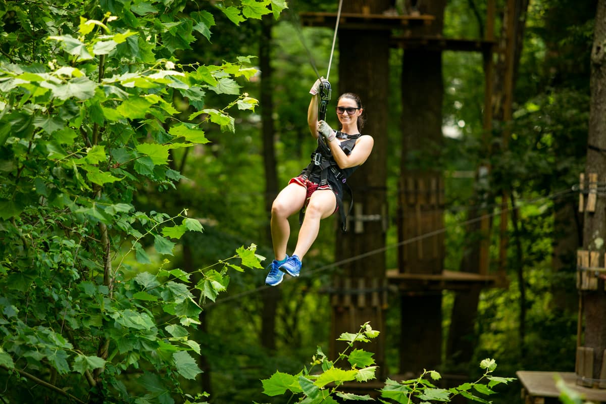 The Aerial Adventure Forest is essentially an obstacle course in the trees and includes climbing, zip lines and combinations of the challenge bridges and zip lines. The Adventure Park at Sandy Spring has 15 trails, which are color-coded, with purple — the easiest — being a 12- to 20-foot-high course, and double black diamond — the most difficult — being 65 feet in the air.  It is the largest aerial climbing course in the US.